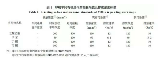 目前在我國(guó)的包裝塑料基材等印刷過(guò)程中大量使用的溶劑型油墨,含有50%~60%的揮發(fā)性組分,如果加上調(diào)油墨粘度所需的稀釋劑,那么在印品干燥時(shí),揮發(fā)性組分的總含量為70%~80%。這些有機(jī)溶劑所揮發(fā)的氣體,通過(guò)呼吸進(jìn)入人體內(nèi),對(duì)人體的肝臟和神經(jīng)系統(tǒng)造成損害;有機(jī)化合物排放到大氣中,與氮氧化物反應(yīng),發(fā)生光化學(xué)反應(yīng),形成光化學(xué)氧化劑而毀壞森林與破壞生態(tài)環(huán)境。一些_制定了“勞動(dòng)衛(wèi)生法”、“有機(jī)溶劑排放法”等一系列法規(guī)。我國(guó)在各種印刷過(guò)程及傳統(tǒng)耗材中存在VOCs排放造成污染問(wèn)題,例如在包裝印刷廠的主要產(chǎn)品為各種塑料薄膜的印刷制品,在生產(chǎn)中大量使用彩色油墨和有機(jī)稀料,油墨用的稀料(溶劑)主要是甲苯、乙酸乙酯、丙酮及少量丁酮。這些溶劑在產(chǎn)品生產(chǎn)過(guò)程中變?yōu)?/font>VOCs廢氣大量排出。因此,對(duì)包裝印刷廠生產(chǎn)車間排出的VOCs廢氣_采取有效的收集方法和凈化工藝進(jìn)行處理。在我國(guó)的工作場(chǎng)所有害因素職業(yè)接觸限值和排放標(biāo)準(zhǔn)中,對(duì)VOCs廢氣的排放作了嚴(yán)格的規(guī)定,如表1所示。如果在印刷車間安裝合理的廢氣收集系統(tǒng)和溶劑回收裝置,可以達(dá)到降低VOCs揮發(fā)量和減少污染的目的;同時(shí)可以回收溶劑資源,這點(diǎn)已經(jīng)被實(shí)踐證明。